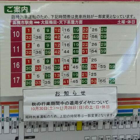 10月31日~11月いっぱいの土日祝(※)に、嵐山直通の臨時「快速特急」と「直通特急」が走っている阪急京都線ですが、定期列車の時刻にも一部変更があり、駅にもその旨が掲示されています。