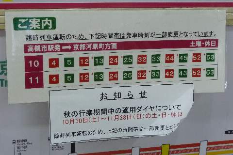 10月31日~11月いっぱいの土日祝(※)に、嵐山直通の臨時「快速特急」と「直通特急」が走っている阪急京都線ですが、定期列車の時刻にも一部変更があり、駅にもその旨が掲示されています。